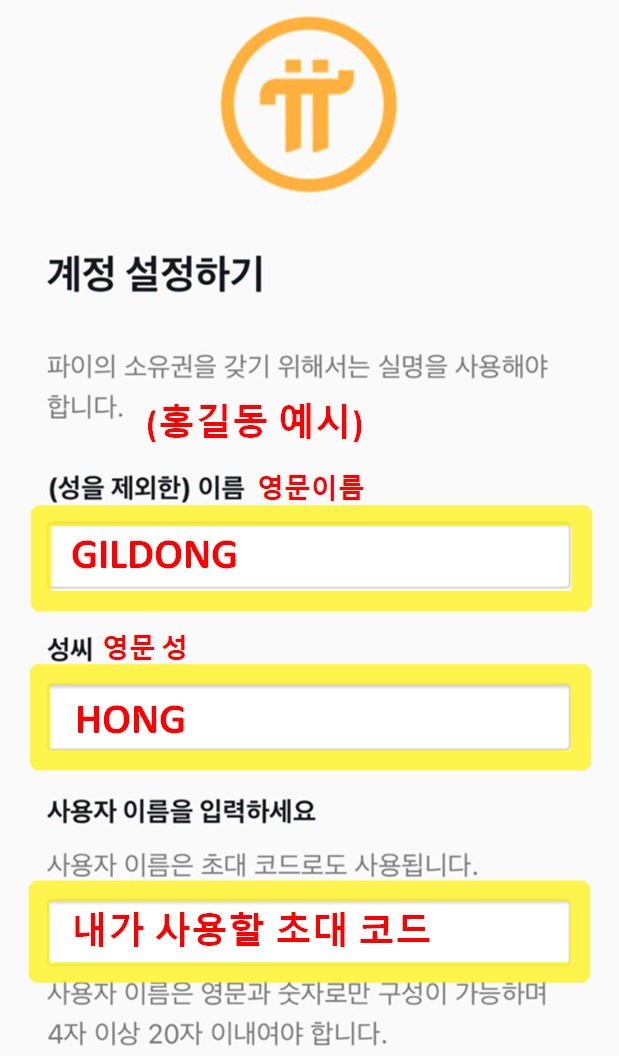 5. 파이코인 채굴방법 - 이름과 성을 입력합니다.