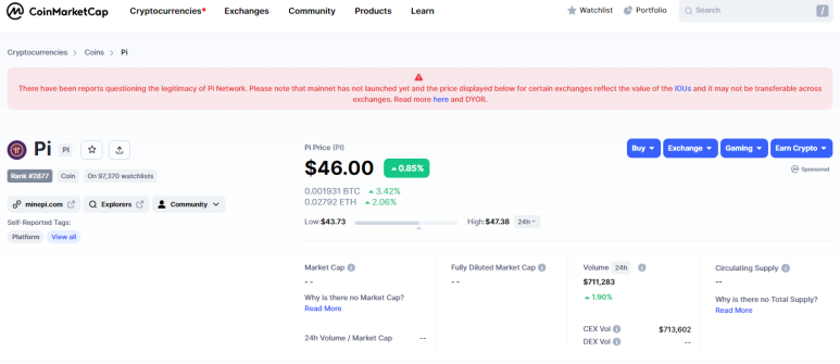 22년 연말 거래소에서 Pi Network의 인기에 IOU 도둑상장을 한 파이코인 상장 시세 정보를 코인마켓캡(Coinmarkecap) 거래소에서 찾아보았습니다.
