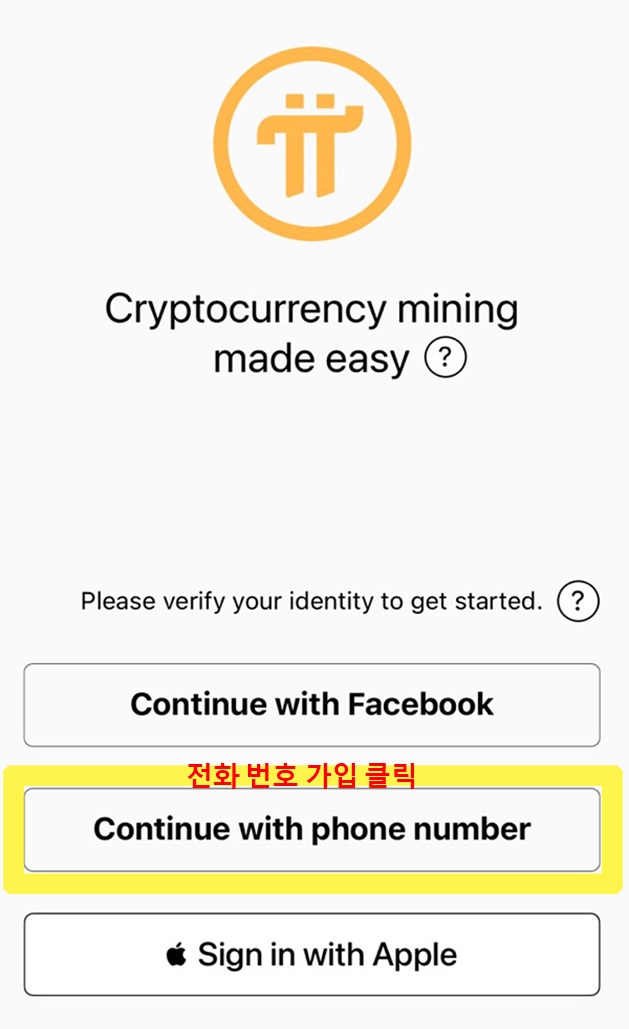 2. 파이코인 채굴방법 - 핸드폰번호, 페이스북, 애플 중 선택하여 가입이 가능합니다.